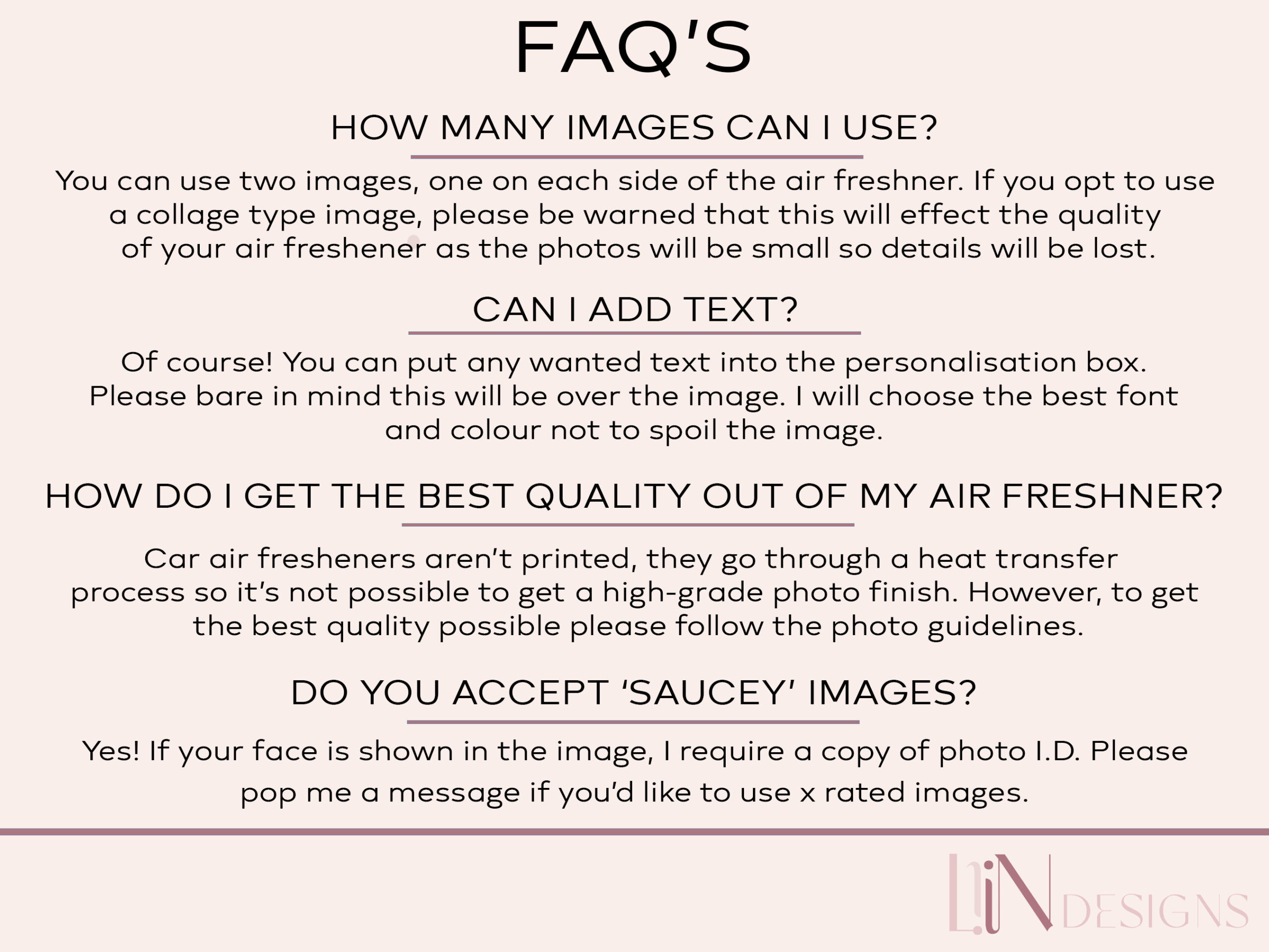 The air freshener is double sided, so you can use up to two pictures. Whether it’s a memorable moment or a quirky selfie, we’ll make sure your car reflects your personality. Just remember, the elastic colour may vary.